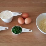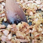 Get a pan on a medium to low heat and add the oil. Get those onions on! I like them caramelised and this takes about 30-40 minutes on a medium to low heat. After around 20 minutes, add the chopped bacon periodically stirring as you go, so it doesn’t burn. Once you have it to your liking remove and set to one side.