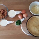 Reduce oven temperature to 180 oC (350 oF, Gas 4). Sprinkle the bacon and onion mixture, cheese and chives over the cooked pastry shell. Whisk the eggs in a medium jug and add the cream and milk, pour into the shell. Bake for 35-40 minutes or until filling has set.