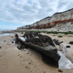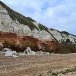 We had a very pleasant walk along the beach, at low tide across the soft wet sand which was scattered with shells, mostly razor clam shells. The cliffs were indeed striped with half white chalk and half red chalk which was pretty cool. Zig-zagging our way across the beach, we stumbled across a ship wreck at the bottom of the cliff, mostly submerged by sand. That was pretty cool too.